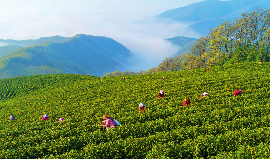 茶工在浙江省湖州市安吉縣杭垓鎮(zhèn)的生態(tài)茶園里采摘明前茶(2023年4月2日攝)夏鵬飛 攝