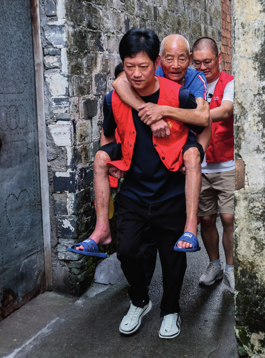 浙江省諸暨市趙家鎮(zhèn)泉畈村村干部和黨員志愿者在臺(tái)風(fēng)來臨前轉(zhuǎn)移危舊房里的老人(2024年9月19日攝)徐昱 攝