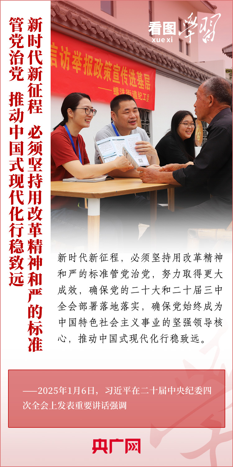 1月6日,習近平總書記在二十屆中央紀委四次全會上發(fā)表重要講話,充分肯定過去一年全面從嚴治黨取得的新進展、新成效,深刻分析當前反腐敗斗爭形勢,對堅決打好反腐敗斗爭攻堅戰(zhàn)、持久戰(zhàn)、總體戰(zhàn)提出明確要求??倳洀娬{,新時代新征程,必須堅持用改革精神和嚴的標準管黨治黨,努力取得更大成效,確保黨的二十大和二十屆三中全會部署落地落實,確保黨始終成為中國特色社會主義事業(yè)的堅強領導核心,推動中國式現(xiàn)代化行穩(wěn)致遠。一起來學習!
