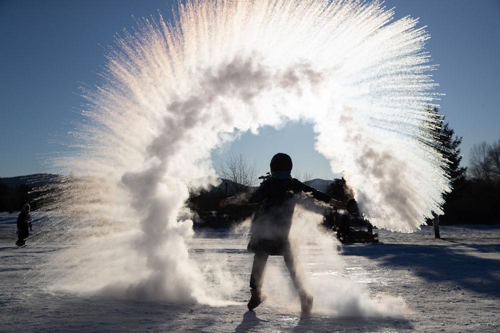 游客在黑龍江漠河市北極村體驗(yàn)“潑水成冰”。