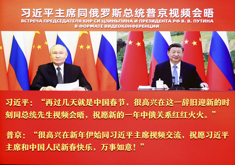 1月21日,中國國家主席習(xí)近平在北京同俄羅斯總統(tǒng)普京舉行視頻會晤,兩國元首互致新年祝福。習(xí)近平強調(diào),新的一年,我愿同總統(tǒng)先生一道,繼續(xù)引領(lǐng)中俄關(guān)系登高望遠(yuǎn),以中俄關(guān)系的穩(wěn)定性和堅韌性應(yīng)對外部環(huán)境的不確定性,共同促進兩國發(fā)展振興,維護國際公平正義。