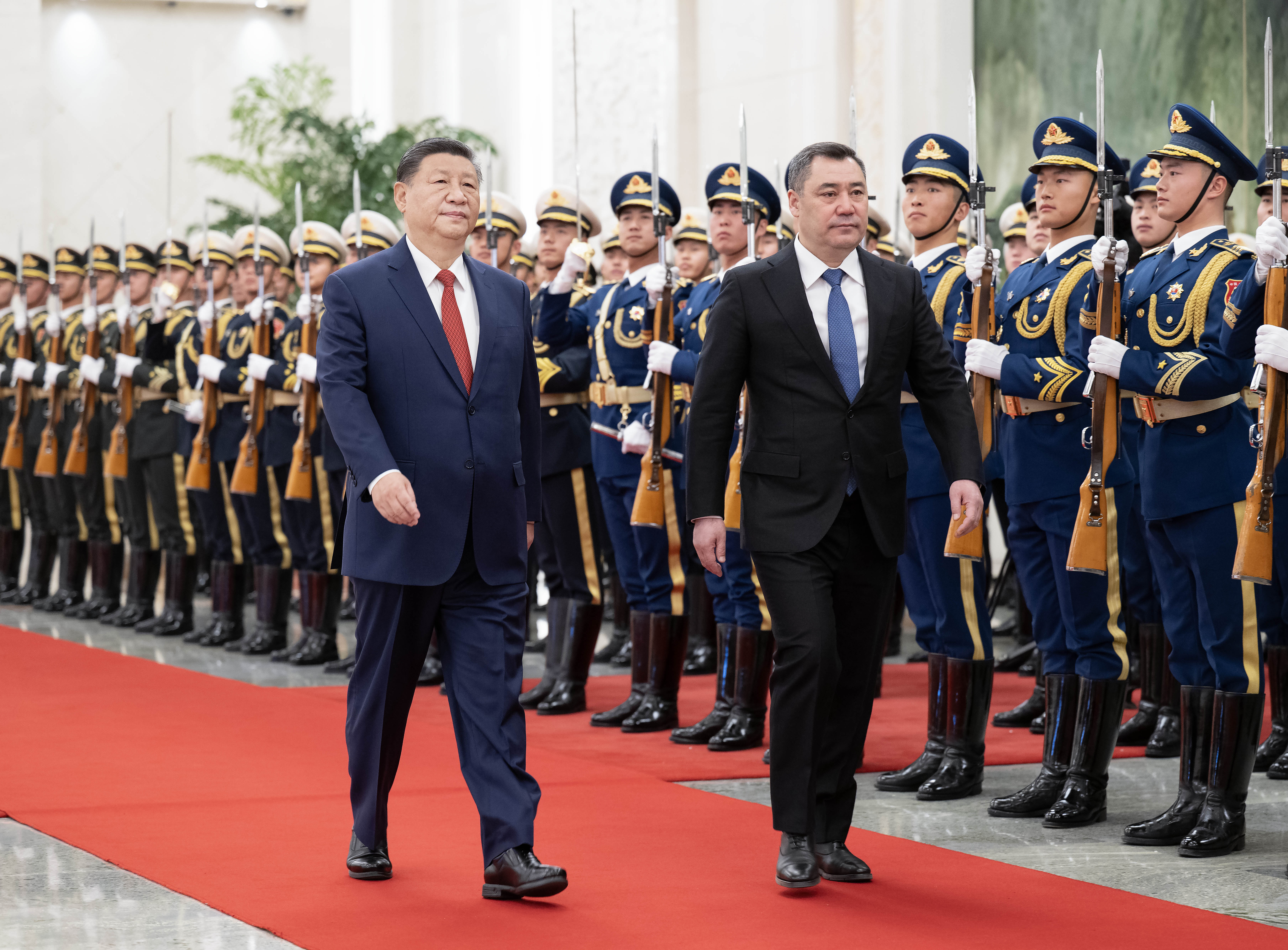 天安門廣場鳴放21響禮炮,禮兵列隊致敬。兩國元首登上檢閱臺,軍樂團(tuán)奏中吉兩國國歌。扎帕羅夫在習(xí)近平陪同下檢閱中國人民解放軍儀仗隊,并觀看分列式。