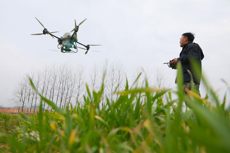 2025年2月14日,在浙江杭州市臨安區(qū)天目山鎮(zhèn)“天目糧倉”糧食功能區(qū),農(nóng)機人員遙控植保無人機給小麥施肥。