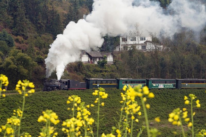 2025年2月14日,四川樂山市犍為縣菜子壩景點試種的早季油菜花進入盛開期,蒸汽小火車穿越油菜花海,吸引不少游客前來觀看。