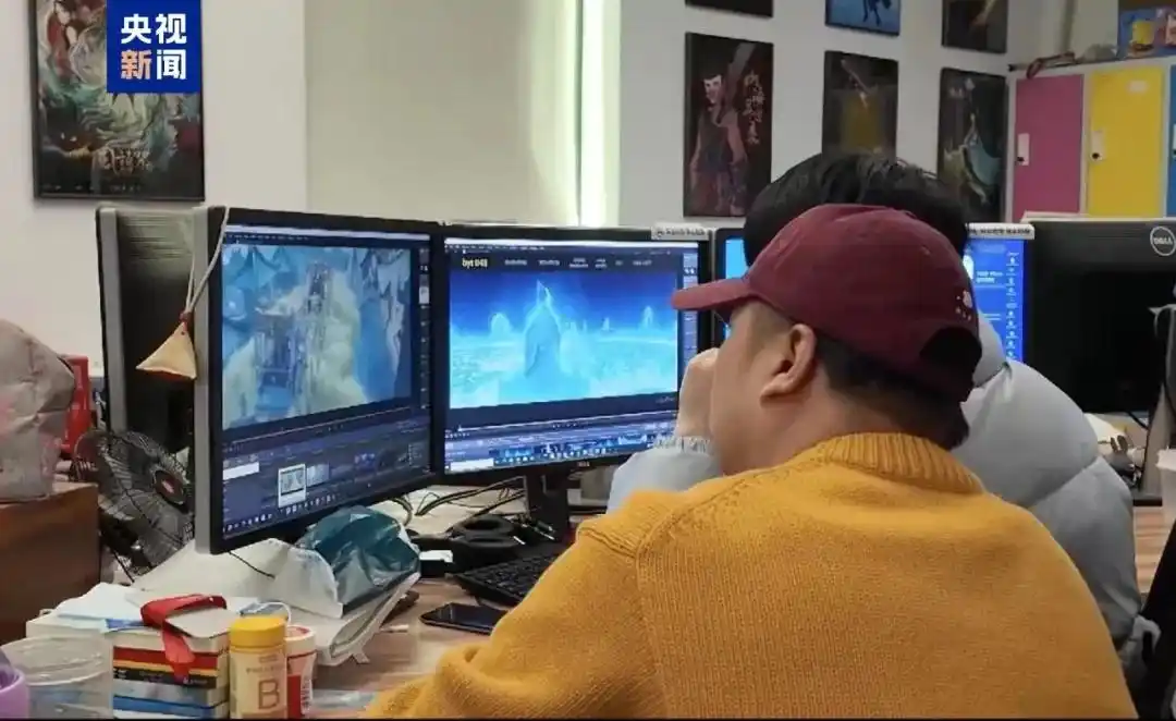 《哪吒2》壯觀的特效背后,是全國138家動畫公司的合力托舉。圖為創(chuàng)作團(tuán)隊正在確認(rèn)畫面效果。