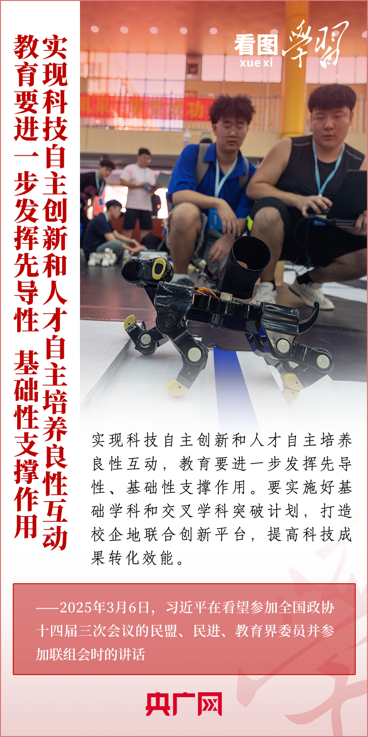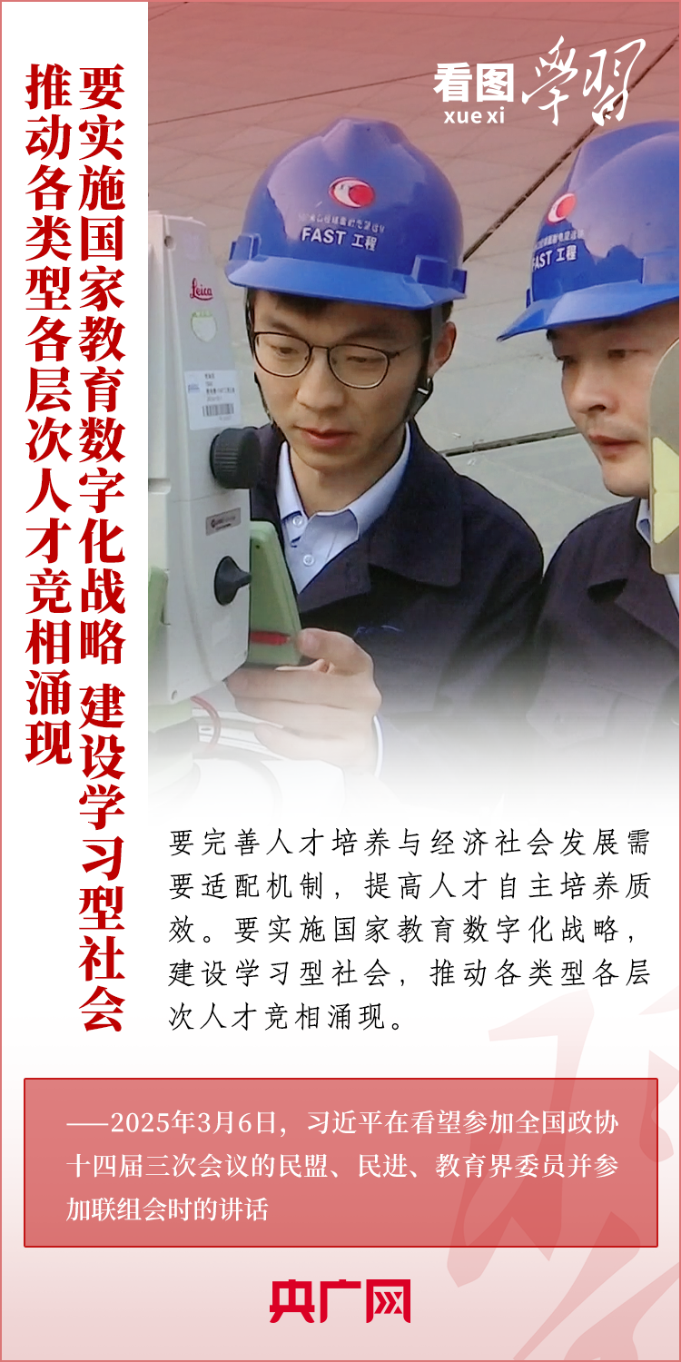 “建設(shè)教育強(qiáng)國(guó)、科技強(qiáng)國(guó)、人才強(qiáng)國(guó),是全黨全社會(huì)的共同責(zé)任?!?月6日,習(xí)近平總書記在看望參加全國(guó)政協(xié)十四屆三次會(huì)議的民盟、民進(jìn)、教育界委員并參加聯(lián)組會(huì)時(shí)發(fā)表重要講話??倳浘妥龊媒逃?、科技、人才工作作出深刻闡釋,強(qiáng)調(diào)必須深刻把握中國(guó)式現(xiàn)代化對(duì)教育、科技、人才的需求,強(qiáng)化教育對(duì)科技和人才的支撐作用,進(jìn)一步形成人才輩出、人盡其才、才盡其用的生動(dòng)局面。一起來學(xué)習(xí)!