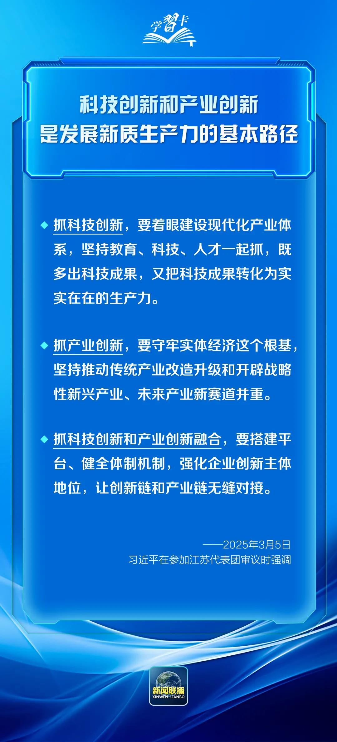 2025年全國兩會期間,習近平總書記參加團組審議討論時,多次提到科技創(chuàng)新這一關(guān)鍵命題,強調(diào)“科技創(chuàng)新和產(chǎn)業(yè)創(chuàng)新,是發(fā)展新質(zhì)生產(chǎn)力的基本路徑”。一起學(xué)習↓