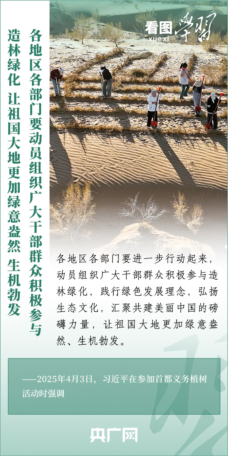 植樹造林是生態(tài)文明建設(shè)重要一環(huán)。4月3日,習(xí)近平總書記參加首都義務(wù)植樹活動(dòng)。在植樹現(xiàn)場(chǎng),總書記高度肯定國(guó)土綠化工作取得來之不易的成績(jī),強(qiáng)調(diào)綠化祖國(guó)必須堅(jiān)持“三綠”并舉、“四庫(kù)”聯(lián)動(dòng),要更加注重“提質(zhì)”“興業(yè)”“利民”,“匯聚共建美麗中國(guó)的磅礴力量,讓祖國(guó)大地更加綠意盎然、生機(jī)勃發(fā)”。一起來學(xué)習(xí)!