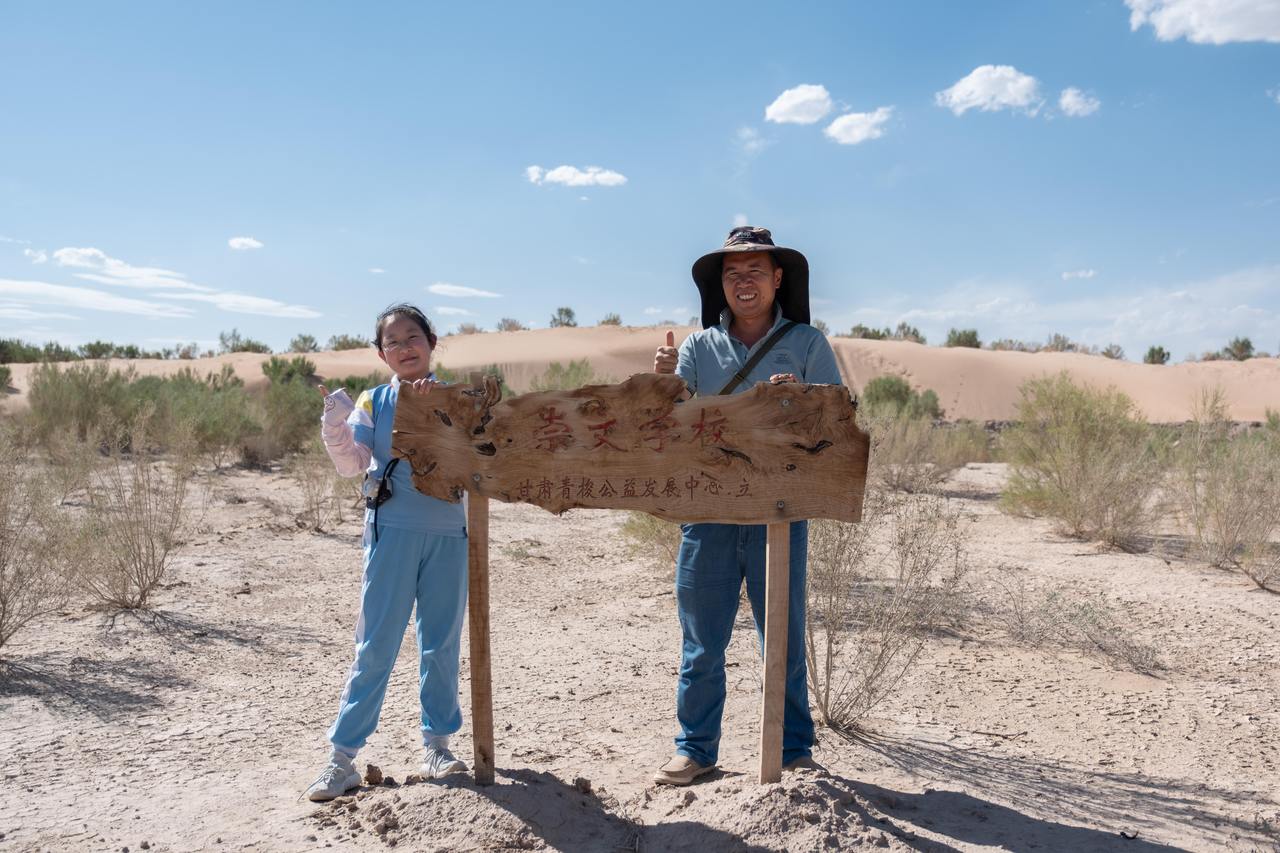 天地茫茫,站在“崇文林”的標志旁,背后是巴丹吉林沙漠。前方的高山上,一座紀念碑高高佇立,上面書寫著習(xí)近平總書記在甘肅視察時強調(diào)的“確保民勤不成為第二個羅布泊”。