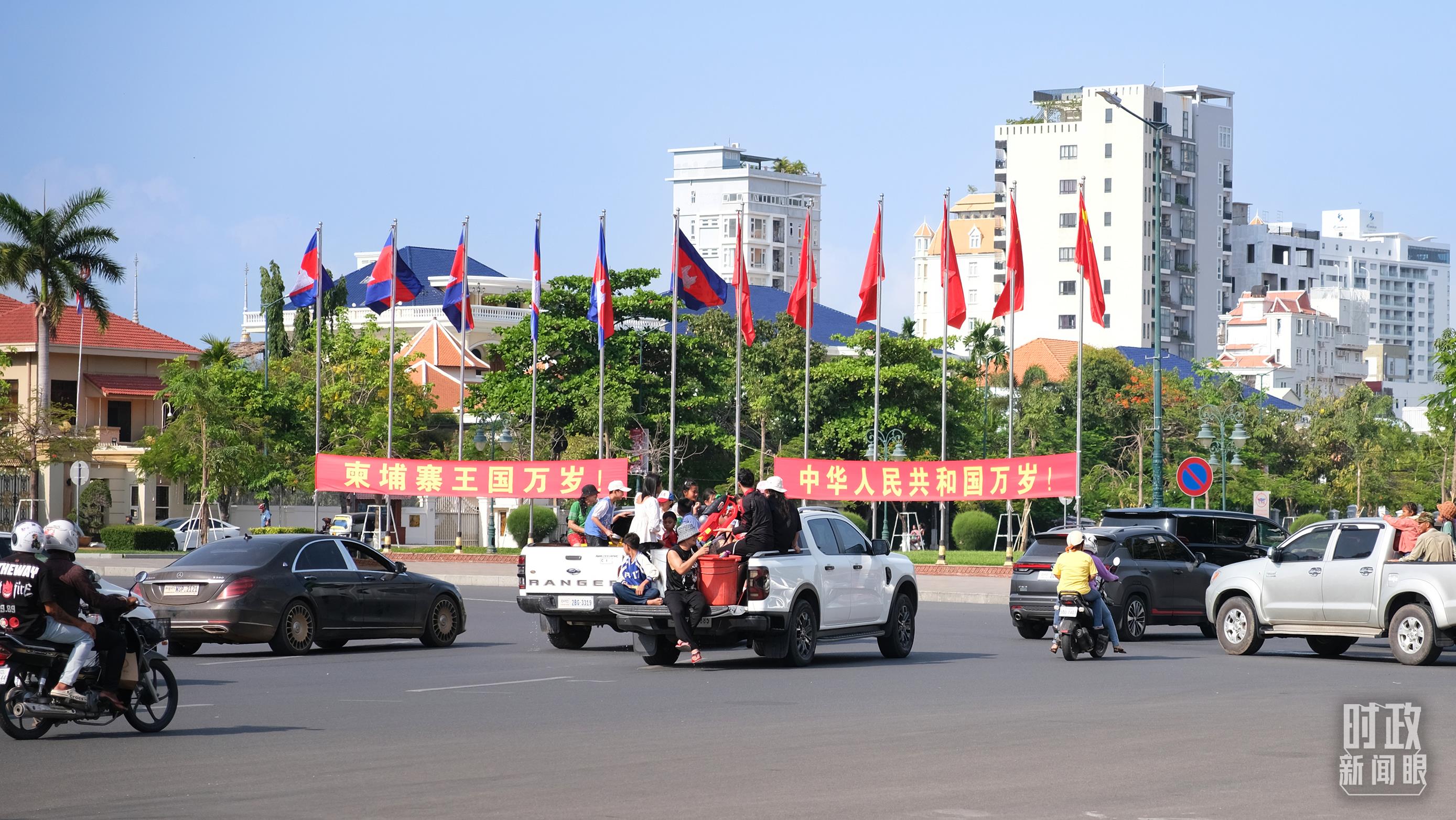 金邊街頭的巨幅兩國(guó)領(lǐng)導(dǎo)人照片和兩國(guó)國(guó)旗。(總臺(tái)央視記者陸泓宇拍攝)