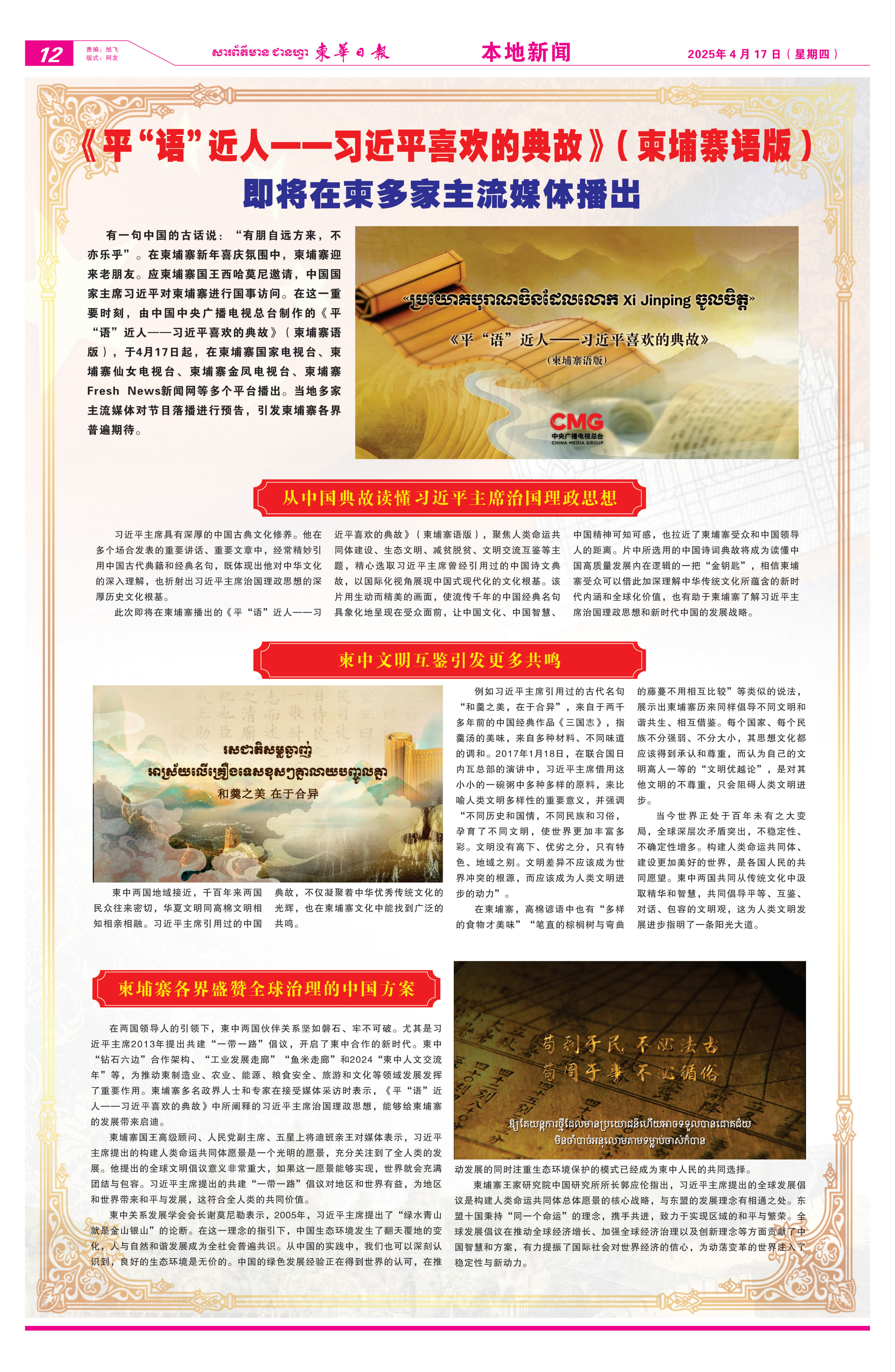 4月12日至17日,《柬華日報》《大都市報》等當(dāng)?shù)貓蠹埧l(fā)節(jié)目播出預(yù)告消息。文章指出,《平“語”近人——習(xí)近平喜歡的典故》(柬埔寨語版)是一把讀懂中國高質(zhì)量發(fā)展內(nèi)在邏輯的“金鑰匙”,相信柬埔寨受眾可以通過這些中國古籍和經(jīng)典名句加深理解中華優(yōu)秀傳統(tǒng)文化所蘊含的新時代內(nèi)涵和全球化價值,了解習(xí)近平主席治國理政思想和新時代中國的發(fā)展戰(zhàn)略。