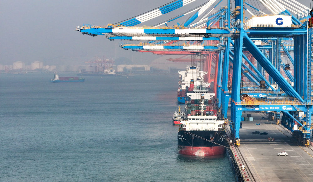 2024年12月31日,遠(yuǎn)洋貨輪在欽州港集裝箱自動化碼頭排隊(duì)卸貨(無人機(jī)照片)。新華社記者 呂帥 攝