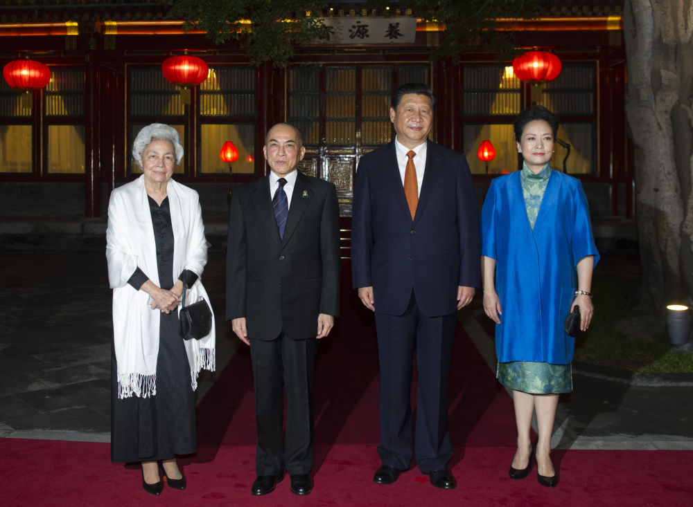2014年9月25日晚,國(guó)家主席習(xí)近平在北京釣魚(yú)臺(tái)國(guó)賓館會(huì)見(jiàn)柬埔寨國(guó)王西哈莫尼和太后莫尼列。習(xí)近平主席夫人彭麗媛參加會(huì)見(jiàn)。