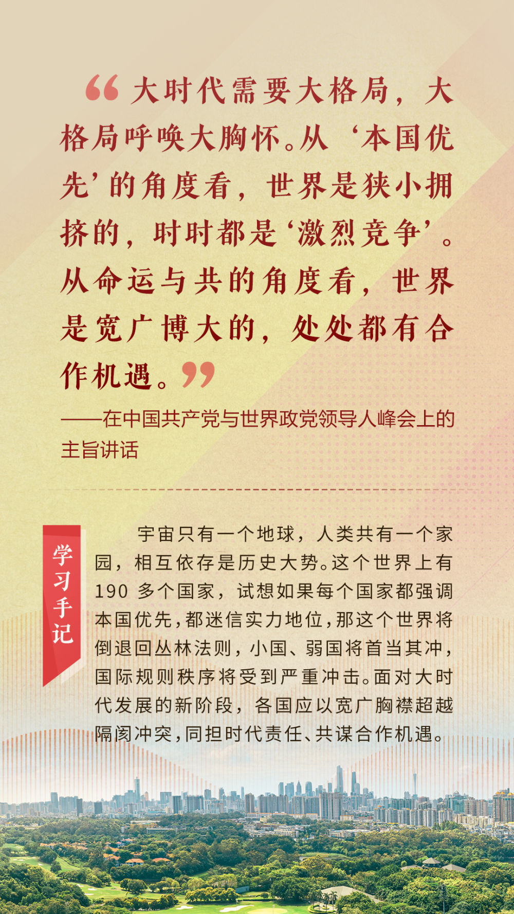 “天空足夠大,地球足夠大,世界也足夠大,容得下各國(guó)共同發(fā)展繁榮”“你中有我、我中有你的命運(yùn)共同體”“與中國(guó)同行就是與機(jī)遇同行”……習(xí)近平總書(shū)記一次次在重要場(chǎng)合發(fā)表重要講話,指引我們站在歷史正確的一邊,站在人類進(jìn)步的一邊,不畏浮云、登高望遠(yuǎn),不懼風(fēng)浪、勇毅前行。