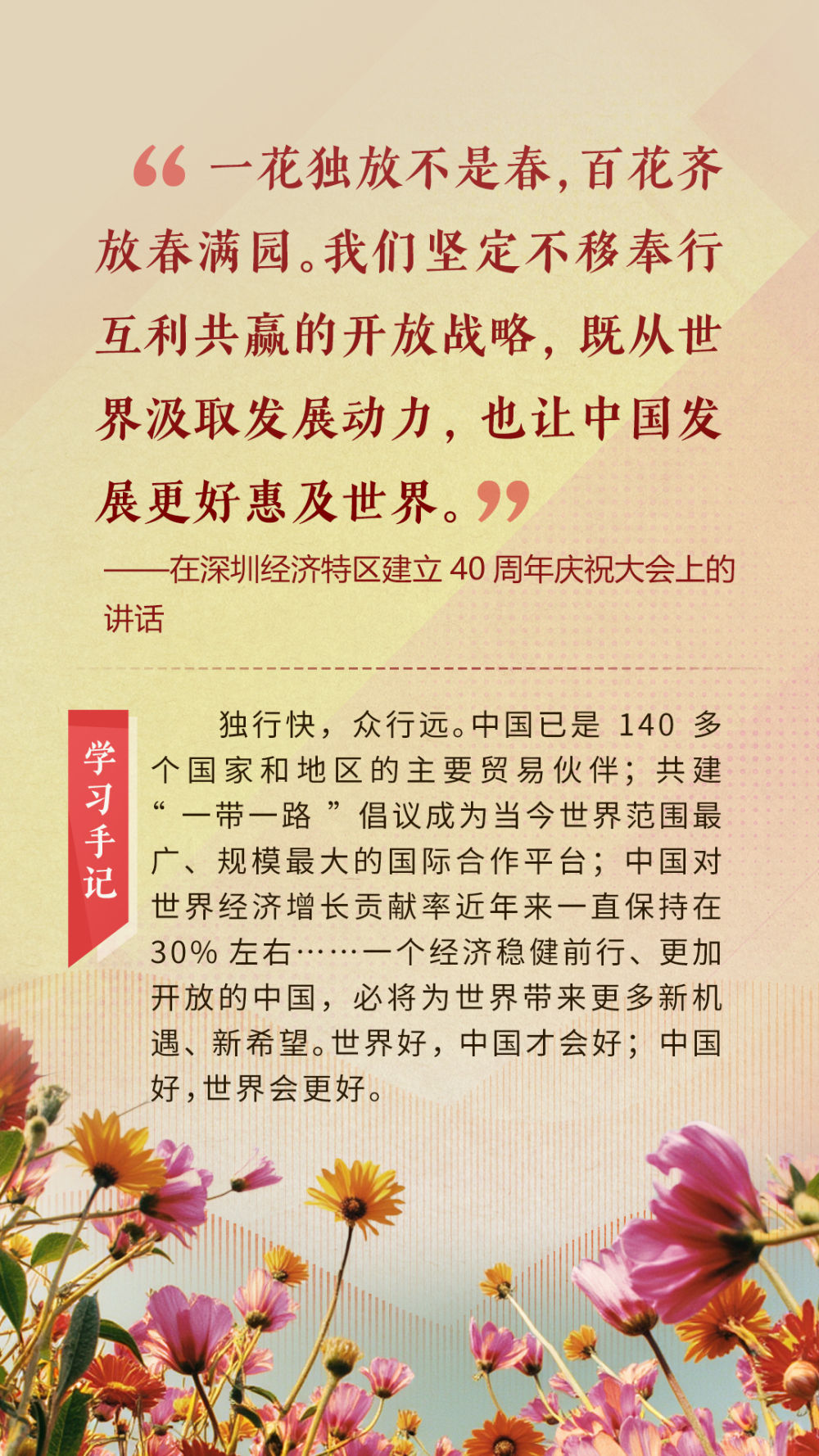 世界怎么了,我們?cè)趺崔k?人類再次站在了何去何從的十字路口。越是在關(guān)鍵時(shí)刻,世界越能聽(tīng)到開(kāi)放合作、互利共贏的中國(guó)聲音,越能看到深化改革、擴(kuò)大開(kāi)放的中國(guó)方案。