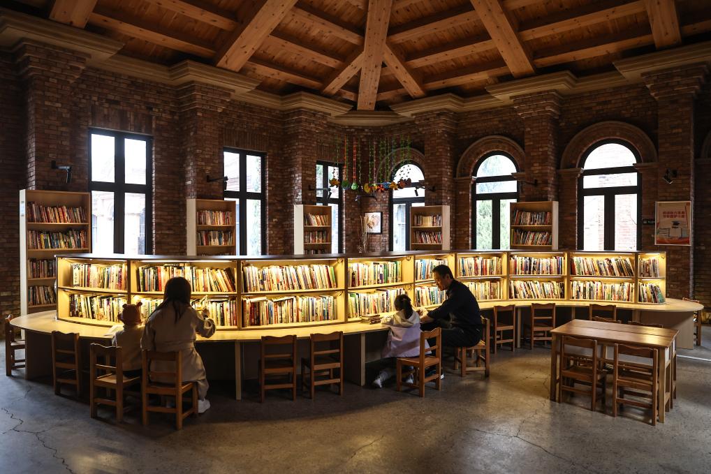 4月17日,小朋友在家長(zhǎng)的陪同下在沈陽(yáng)市鐵西區(qū)奉天工場(chǎng)文創(chuàng)園內(nèi)的城市書(shū)房?jī)?nèi)讀書(shū)。新華社記者 潘昱龍 攝