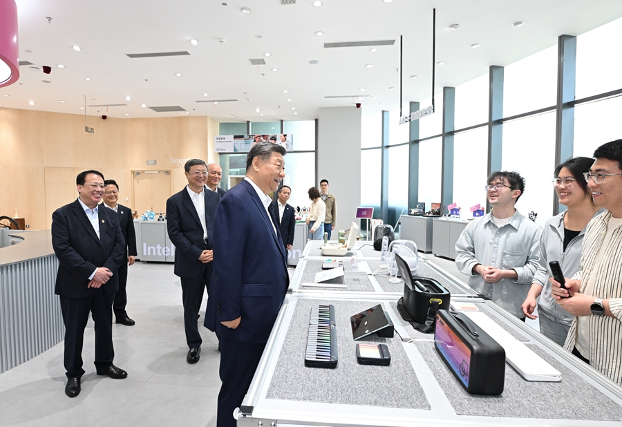 4月29日,中共中央總書記、國家主席、中央軍委主席習(xí)近平在上??疾?。這是習(xí)近平在位于徐匯區(qū)的上海“模速空間”大模型創(chuàng)新生態(tài)社區(qū)人工智能產(chǎn)品體驗(yàn)店考察。