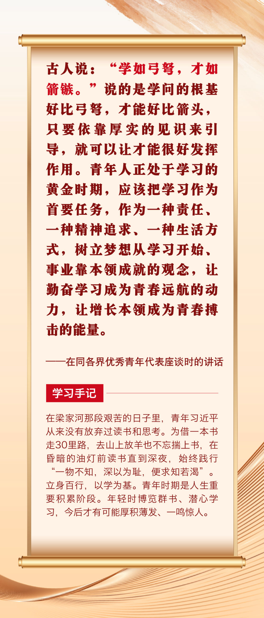 “青年者,國家之魂。”青年一代以何種精神風(fēng)貌站上時代舞臺,關(guān)乎祖國的明天、民族的未來。黨的十八大以來,習(xí)近平總書記圍繞青年成長成才作出許多重要論述。其中,有信手拈來的精妙典故,有貫古通今的廣征博引,引領(lǐng)廣大青年不斷在中華文化的浸潤中堅定中國心、涵養(yǎng)民族魂,成長為堪當(dāng)復(fù)興重任的時代新人。