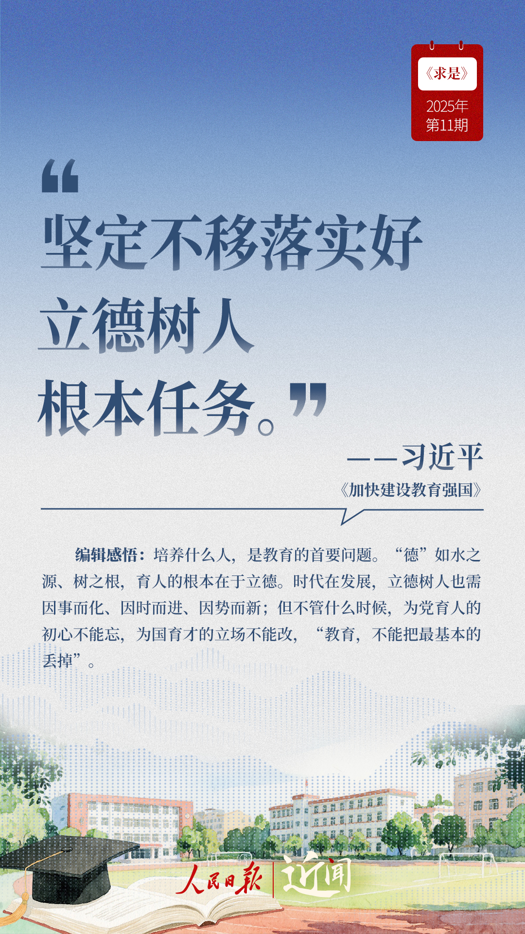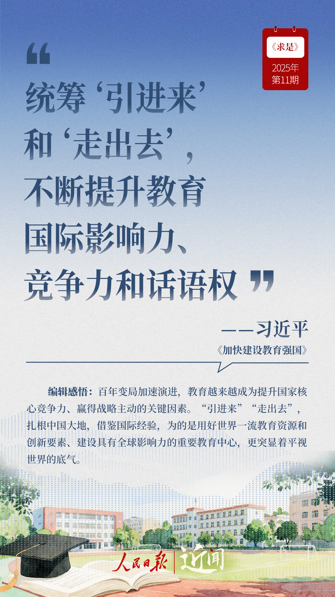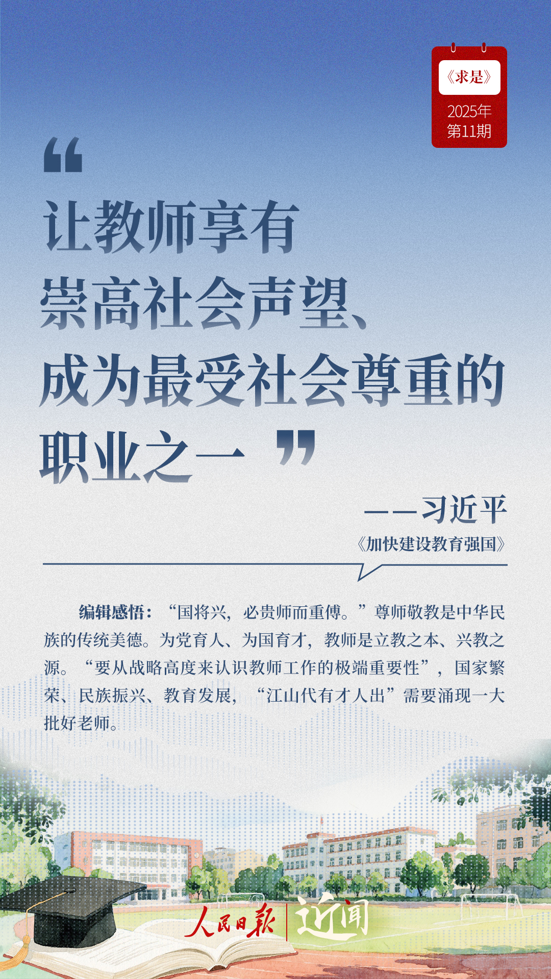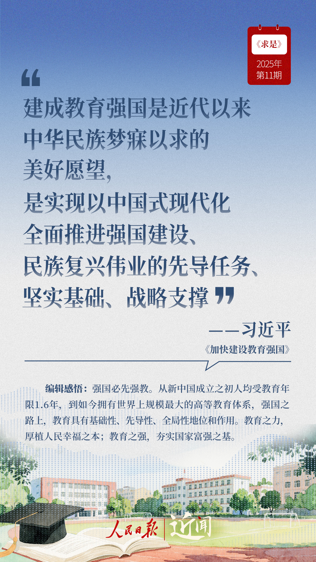 教育是國(guó)之大計(jì)、黨之大計(jì)。日前,《求是》雜志發(fā)表習(xí)近平總書(shū)記重要文章《加快建設(shè)教育強(qiáng)國(guó)》?!叭姘盐战逃恼螌傩?、人民屬性、戰(zhàn)略屬性”“讓教育改革發(fā)展成果更多更公平惠及全體人民”“讓教師享有崇高社會(huì)聲望、成為最受社會(huì)尊重的職業(yè)之一”……通過(guò)這些話,一起感悟習(xí)近平總書(shū)記對(duì)教育強(qiáng)國(guó)建設(shè)的謀劃與部署。
