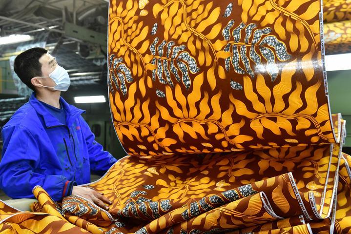 2025年2月25日,在位于山東省濱州市的愉悅家紡有限公司,工作人員在生產(chǎn)出口非洲的布匹。