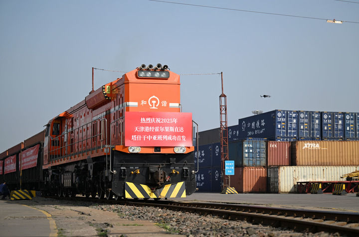 2025年5月20日,2025年首列天津港經(jīng)霍爾果斯直達(dá)塔什干的中亞班列從天津港物捷三堆場發(fā)車。新華社記者 趙子碩 攝