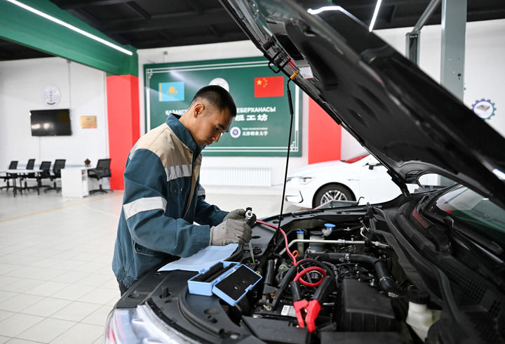 2025年5月9日,在哈薩克斯坦東哈薩克斯坦州首府厄斯克門的魯班工坊,學(xué)員練習(xí)汽車檢修技能。新華社記者 李任滋 攝