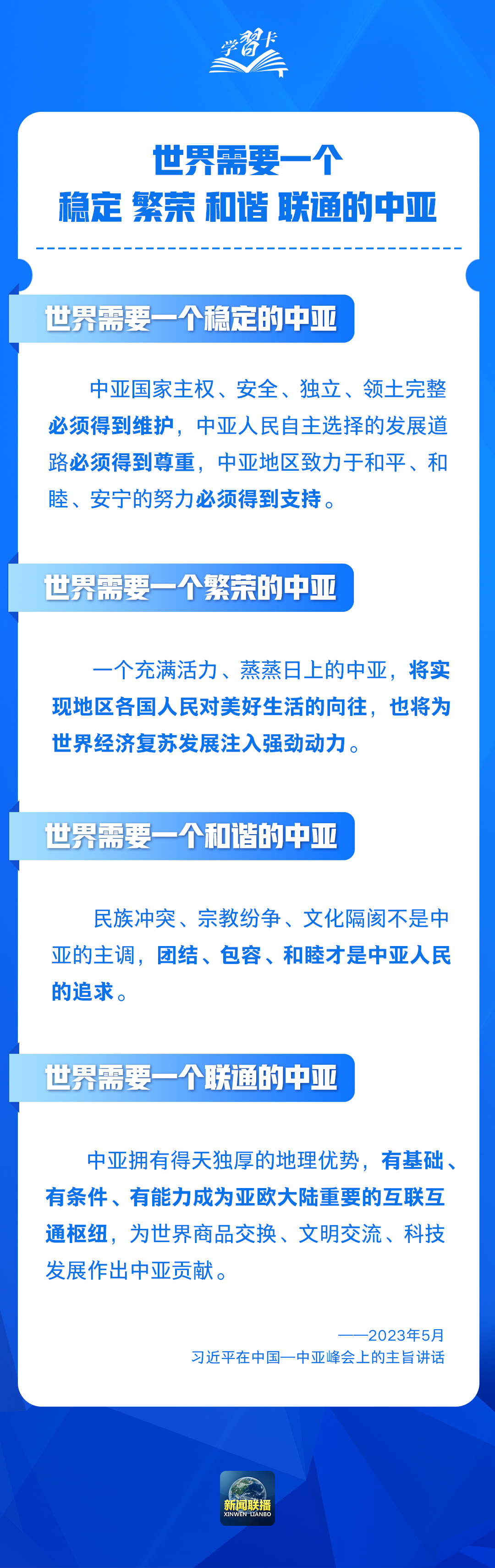 中亞是亞歐大陸的中心,處在聯(lián)通東西、貫穿南北的十字路口。習近平主席強調(diào),深化中國—中亞合作,是我們這代領導人著眼未來作出的戰(zhàn)略抉擇,順應世界大勢,符合人民期盼。