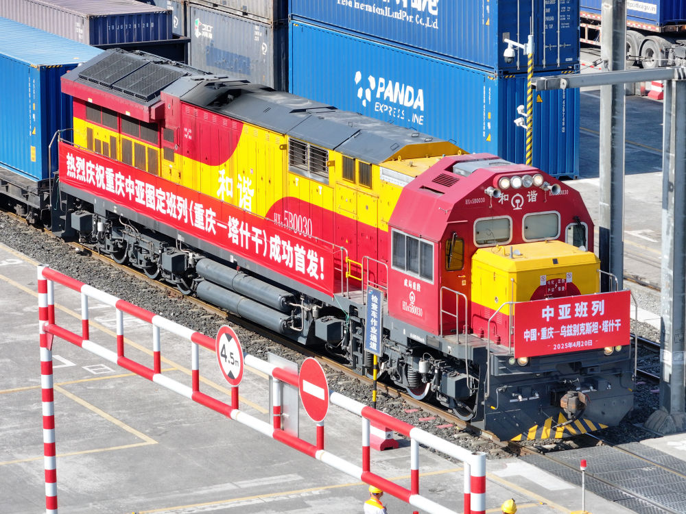 4月20日,圖定中亞班列在重慶團(tuán)結(jié)村中心站等候發(fā)車(無人機照片)。新華社記者 唐奕 攝
