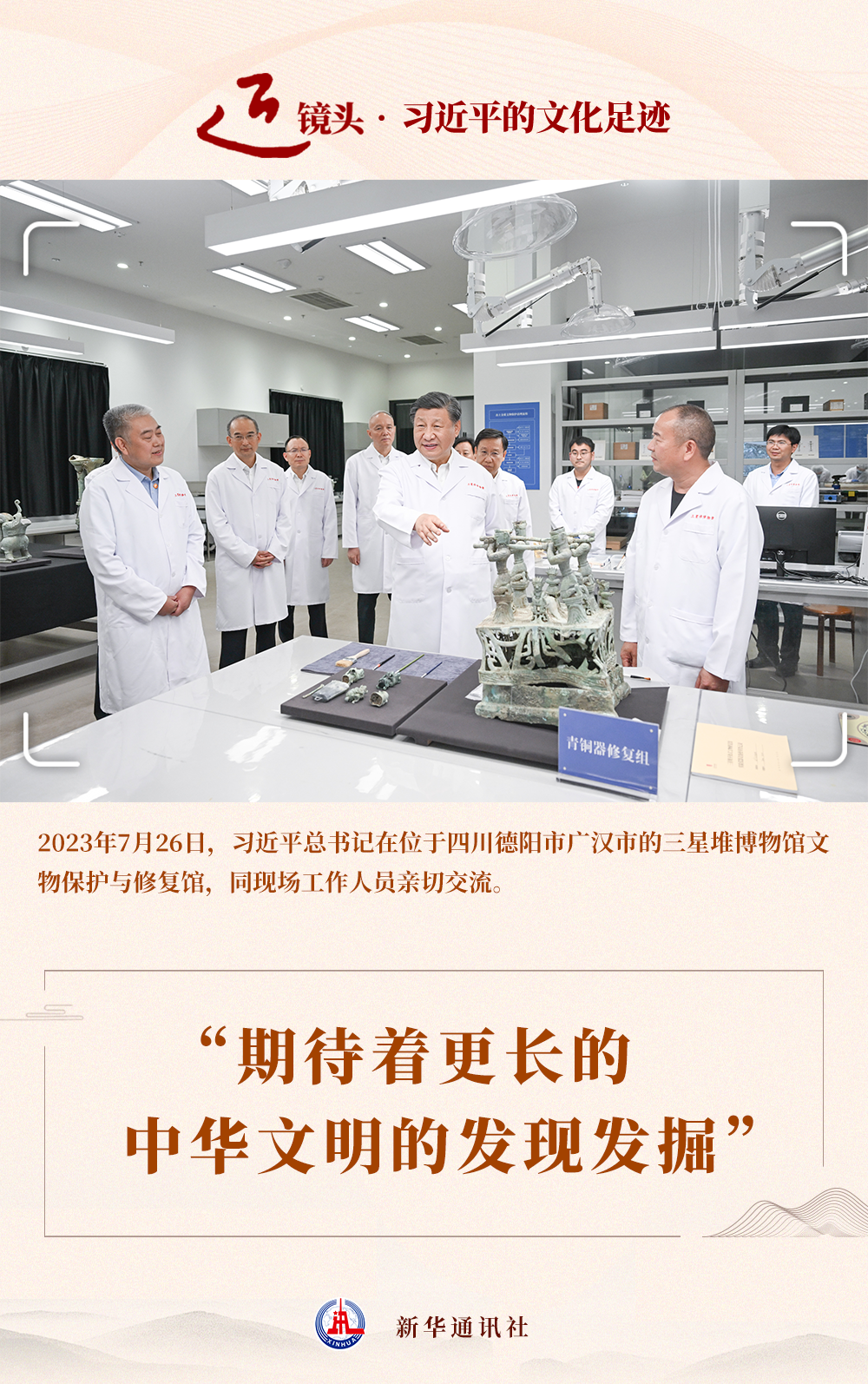 “總書記在三星堆新一輪考古發(fā)掘出土的青銅神壇底座前駐足端詳,詢問起這件繁復精美器物的修復過程。我告訴總書記,修復這件器物至少得一年,總書記感嘆‘這個工作不容易!’,勉勵我們發(fā)揚慢工出細活的精神,慢慢來,久久為功,搞成一件是一件?!惫鶟h中說。