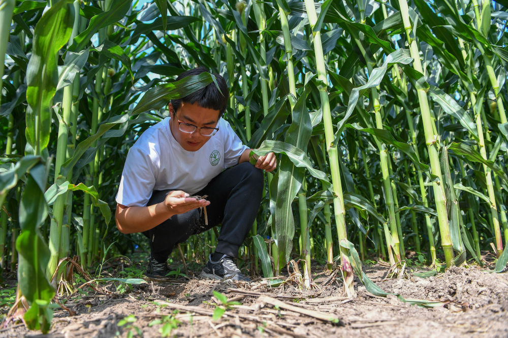 2023年7月31日,在位于吉林省四平市梨樹縣的中國(guó)農(nóng)業(yè)大學(xué)“科技小院”保護(hù)性耕作試驗(yàn)田,一名學(xué)生查看玉米根部在黑土中的生長(zhǎng)情況。