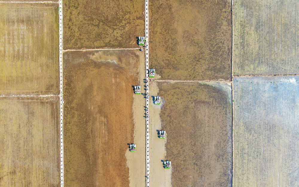 2022年5月13日,在遼寧省鐵嶺市鐵嶺縣新臺(tái)子鎮(zhèn),農(nóng)民駕駛農(nóng)機(jī)在稻田里插秧(無(wú)人機(jī)照片)。