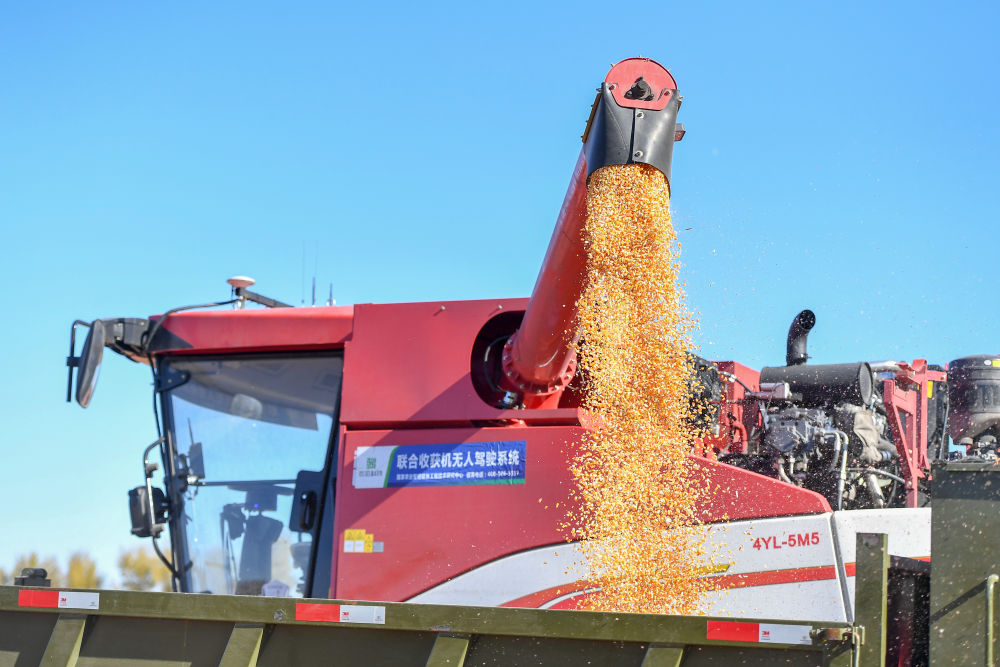2023年10月19日,在中國(guó)科學(xué)院“黑土糧倉(cāng)”科技會(huì)戰(zhàn)長(zhǎng)春示范區(qū)公主嶺示范基地,無(wú)人駕駛農(nóng)機(jī)將收獲的玉米裝車。