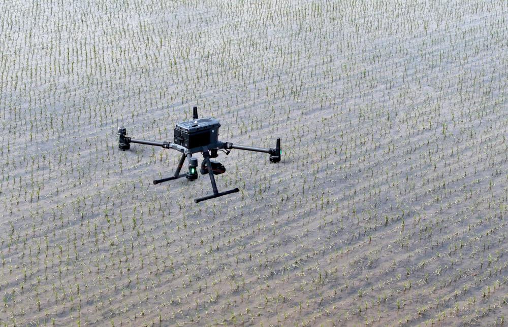 2025年5月21日,在黑龍江省北大荒農(nóng)業(yè)股份八五六分公司第六管理區(qū)農(nóng)業(yè)現(xiàn)代化示范區(qū),搭載多光譜、可見光攝像頭的無(wú)人機(jī)對(duì)水稻插秧后田塊進(jìn)行土壤墑情監(jiān)測(cè)(無(wú)人機(jī)照片)。