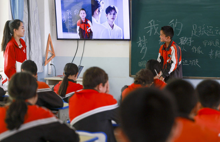 新疆克孜勒蘇柯爾克孜自治州阿圖什市哈拉峻鄉(xiāng)謝依特小學(xué),是一所主要面向柯爾克孜族學(xué)生的村級(jí)小學(xué),2022年8月成為該州首個(gè)西部計(jì)劃志愿者包校支教的試點(diǎn)學(xué)校。23名戍邊支教西部計(jì)劃志愿者服務(wù)隊(duì)的志愿者,在這所小學(xué)承擔(dān)著教書育人的工作。經(jīng)過近三年的支教服務(wù),學(xué)生的學(xué)習(xí)成績(jī)顯著提高,得到當(dāng)?shù)貜V泛認(rèn)可。這是2025年4月23日,支教教師高淑賢(左一)在班級(jí)里展示她為學(xué)生們制作的“AI夢(mèng)想職業(yè)照”。