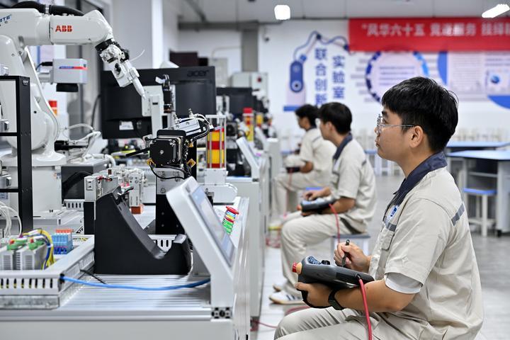 2024年7月26日,湖南鐵道職業(yè)技術(shù)學(xué)院的學(xué)生在工業(yè)機(jī)器人基礎(chǔ)應(yīng)用實(shí)訓(xùn)室接受工業(yè)機(jī)器人操控技能訓(xùn)練。教育部發(fā)布的數(shù)據(jù)顯示,近年來,現(xiàn)代制造業(yè)、戰(zhàn)略性新興產(chǎn)業(yè)和現(xiàn)代服務(wù)業(yè)70%以上的新增一線從業(yè)人員來自職業(yè)院校。職業(yè)院校已經(jīng)成為培養(yǎng)大國(guó)工匠、能工巧匠、高技能人才的主陣地。
