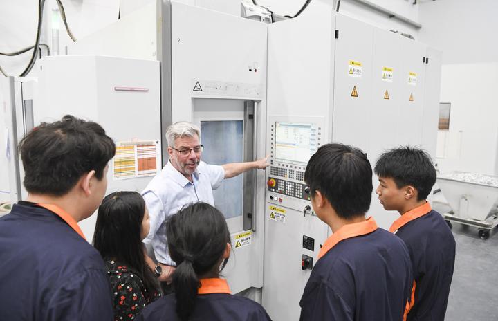 2024年4月16日,在位于重慶市永川區(qū)中德產(chǎn)業(yè)園的埃斯維(重慶)機(jī)床有限公司,公司技術(shù)總監(jiān)向重慶城市職業(yè)學(xué)院中德產(chǎn)業(yè)學(xué)院學(xué)生介紹設(shè)備操作規(guī)范。近年來,重慶城市職業(yè)學(xué)院聯(lián)合德國(guó)教育力量共建產(chǎn)業(yè)學(xué)院,引入職業(yè)教育先進(jìn)經(jīng)驗(yàn),著力培養(yǎng)適合制造型企業(yè)需求的高素質(zhì)技能技術(shù)人才。