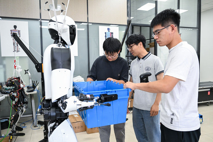 近年來,湖北省加快布局人形機(jī)器人領(lǐng)域,依托省內(nèi)高校院所的人才優(yōu)勢(shì)和創(chuàng)新體系優(yōu)勢(shì),組織武漢大學(xué)、華中科技大學(xué)等參與人形機(jī)器人相關(guān)項(xiàng)目研發(fā),集中推出“天問”“勞動(dòng)者”“荊楚”等一系列人形機(jī)器人。這是2025年5月29日,在華中科技大學(xué)機(jī)械科學(xué)與工程學(xué)院,博士研究生丁濤(右二)和團(tuán)隊(duì)成員測(cè)試“荊楚”人形機(jī)器人的搬運(yùn)能力。