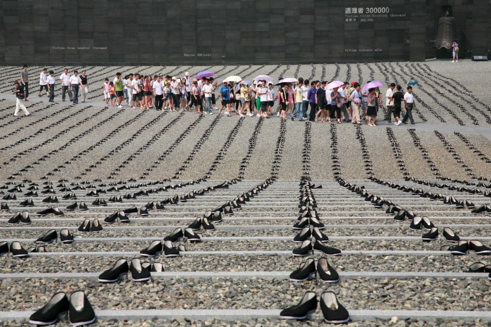 2010年8月15日,在侵華日軍南京大屠殺遇難同胞紀(jì)念館的和平公園,6830雙布鞋被整齊擺放,紀(jì)念在日本遇害的中國(guó)勞工。