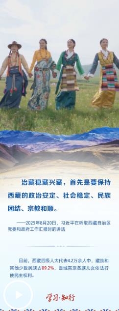 2025年8月20日,習(xí)近平總書記率中央代表團(tuán)乘專機抵達(dá)拉薩,出席西藏自治區(qū)成立60周年慶?;顒?。在聽取西藏自治區(qū)黨委和政府工作匯報時,習(xí)近平總書記強調(diào),“持續(xù)深入抓好穩(wěn)定、發(fā)展、生態(tài)、強邊四件大事,努力建設(shè)團(tuán)結(jié)富裕文明和諧美麗的社會主義現(xiàn)代化新西藏”。
