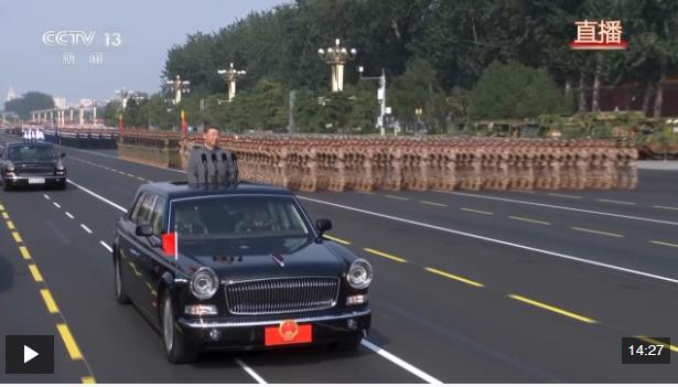 在雄壯的軍樂聲中,習(xí)近平乘車沿著寬闊的長(zhǎng)安街,依次檢閱徒步方隊(duì)和裝備方隊(duì)。