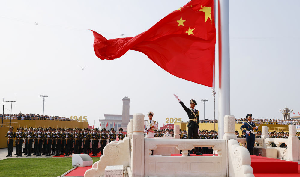 2025年9月3日,紀(jì)念中國人民抗日戰(zhàn)爭暨世界反法西斯戰(zhàn)爭勝利80周年大會在北京隆重舉行。這是天安門廣場舉行隆重的升國旗儀式。