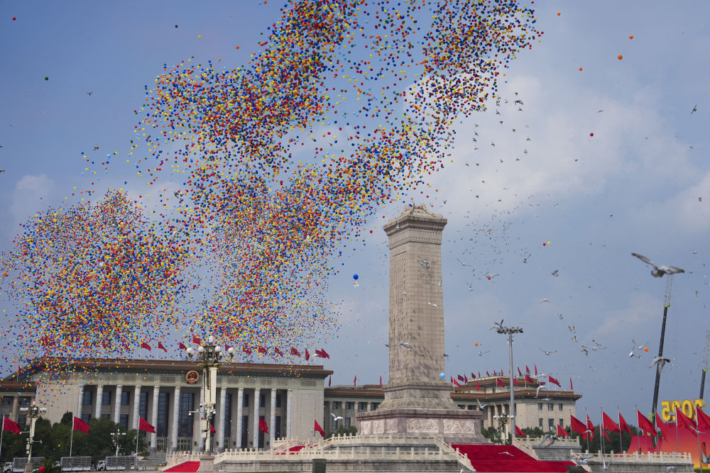 2025年9月3日,紀(jì)念中國人民抗日戰(zhàn)爭暨世界反法西斯戰(zhàn)爭勝利80周年大會在北京隆重舉行。這是紀(jì)念大會現(xiàn)場放飛氣球和鴿子。新華社記者 牟宇 攝