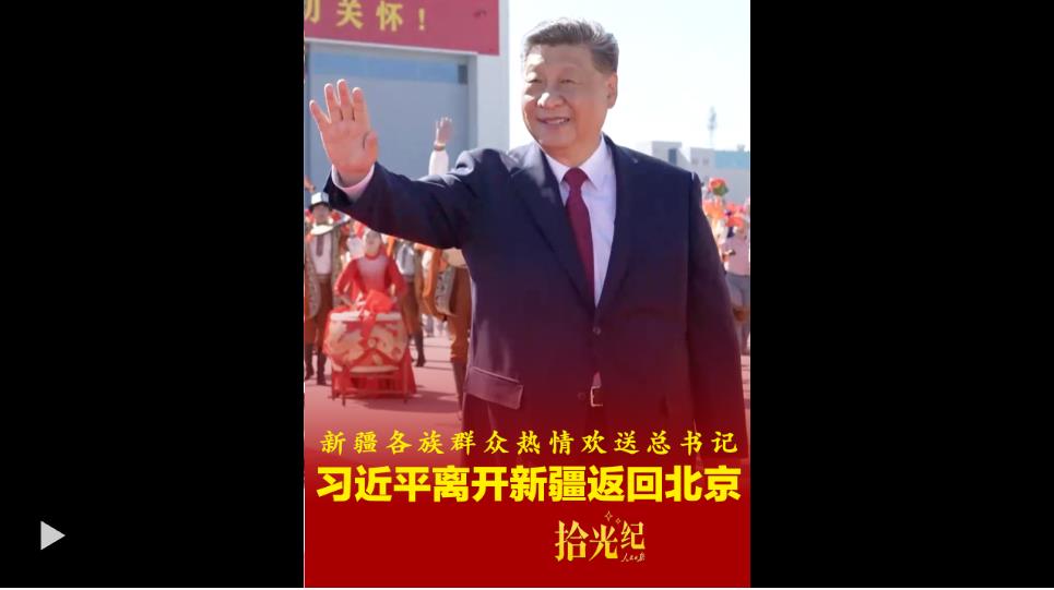 25日,習(xí)近平乘專機(jī)返回北京。烏魯木齊天山機(jī)場(chǎng)奏響別具特色的樂(lè)曲《我們?cè)谝黄稹罚髯迦罕娸d歌載舞熱情歡送總書(shū)記。
