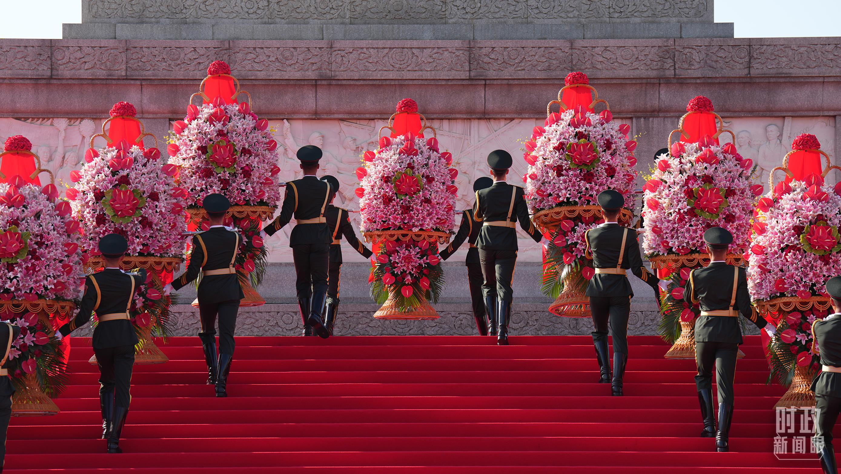 18名禮兵穩(wěn)穩(wěn)抬起花籃,緩步走向人民英雄紀(jì)念碑,將花籃擺放在紀(jì)念碑基座上。