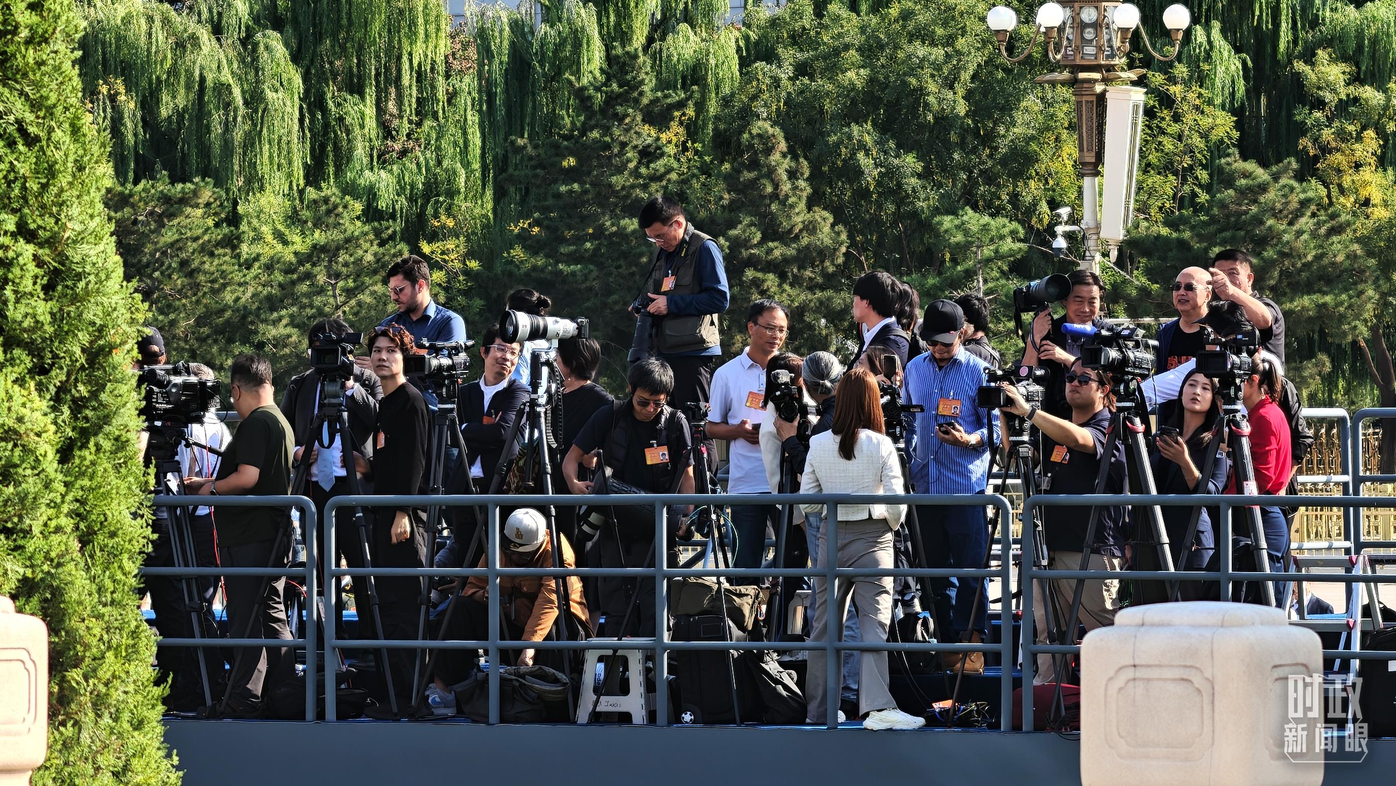 9月30日,天安門廣場上現(xiàn)場報(bào)道的記者。(總臺央視記者鄂介甫拍攝)