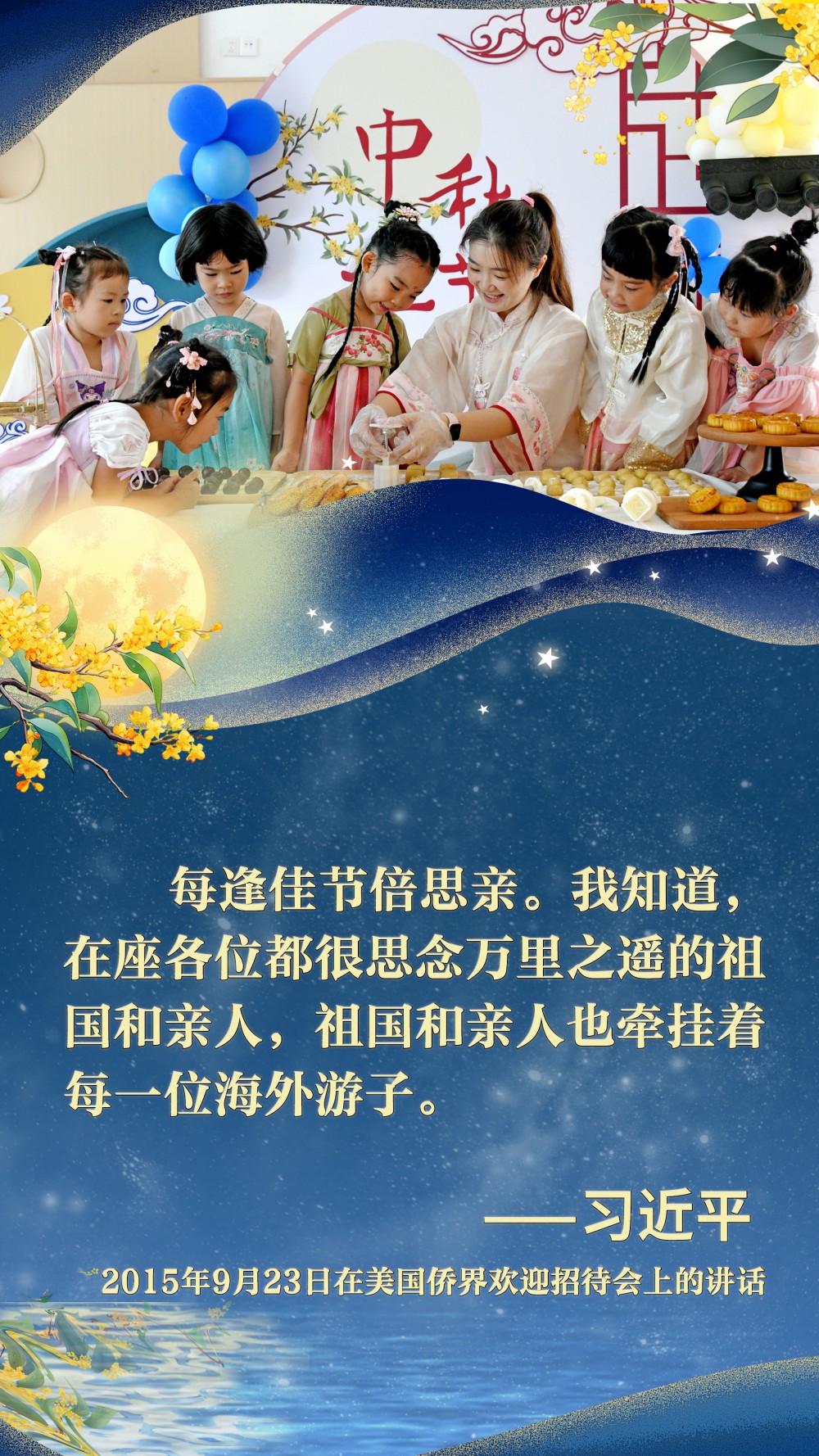 2015年9月23日,中秋佳節(jié)前夕,習(xí)近平總書記在西雅圖出席美國僑界歡迎招待會(huì)。他為參加招待會(huì)的同胞們帶去了來自家鄉(xiāng)的月餅,并熱情地“歡迎大家?;丶铱纯础薄?/p>
