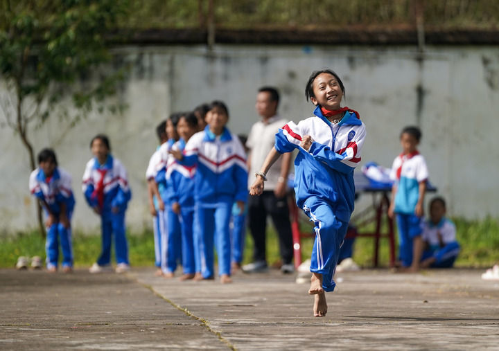 2025年9月15日,云南省普洱市孟連傣族拉祜族佤族自治縣臘福小學(xué)學(xué)生課間在操場(chǎng)進(jìn)行奔跑接力比賽。新華社記者 陳欣波 攝