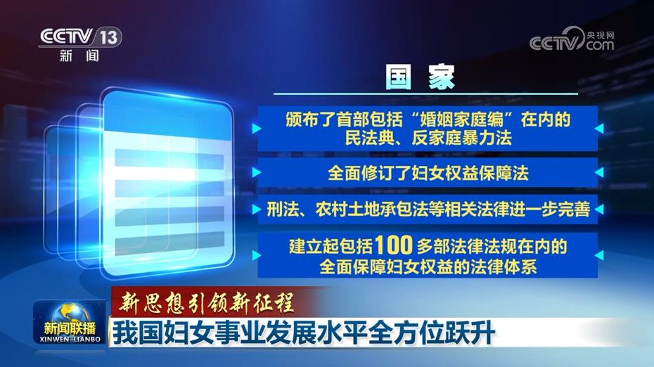 新時(shí)代,保障婦女權(quán)益作為國(guó)家意志充分彰顯,法治保障體系更加完善。國(guó)家頒布了首部包括“婚姻家庭編”在內(nèi)的民法典、反家庭暴力法,全面修訂了婦女權(quán)益保障法,刑法、農(nóng)村土地承包法等相關(guān)法律進(jìn)一步完善,建立起包括100多部法律法規(guī)在內(nèi)的全面保障婦女權(quán)益的法律體系。