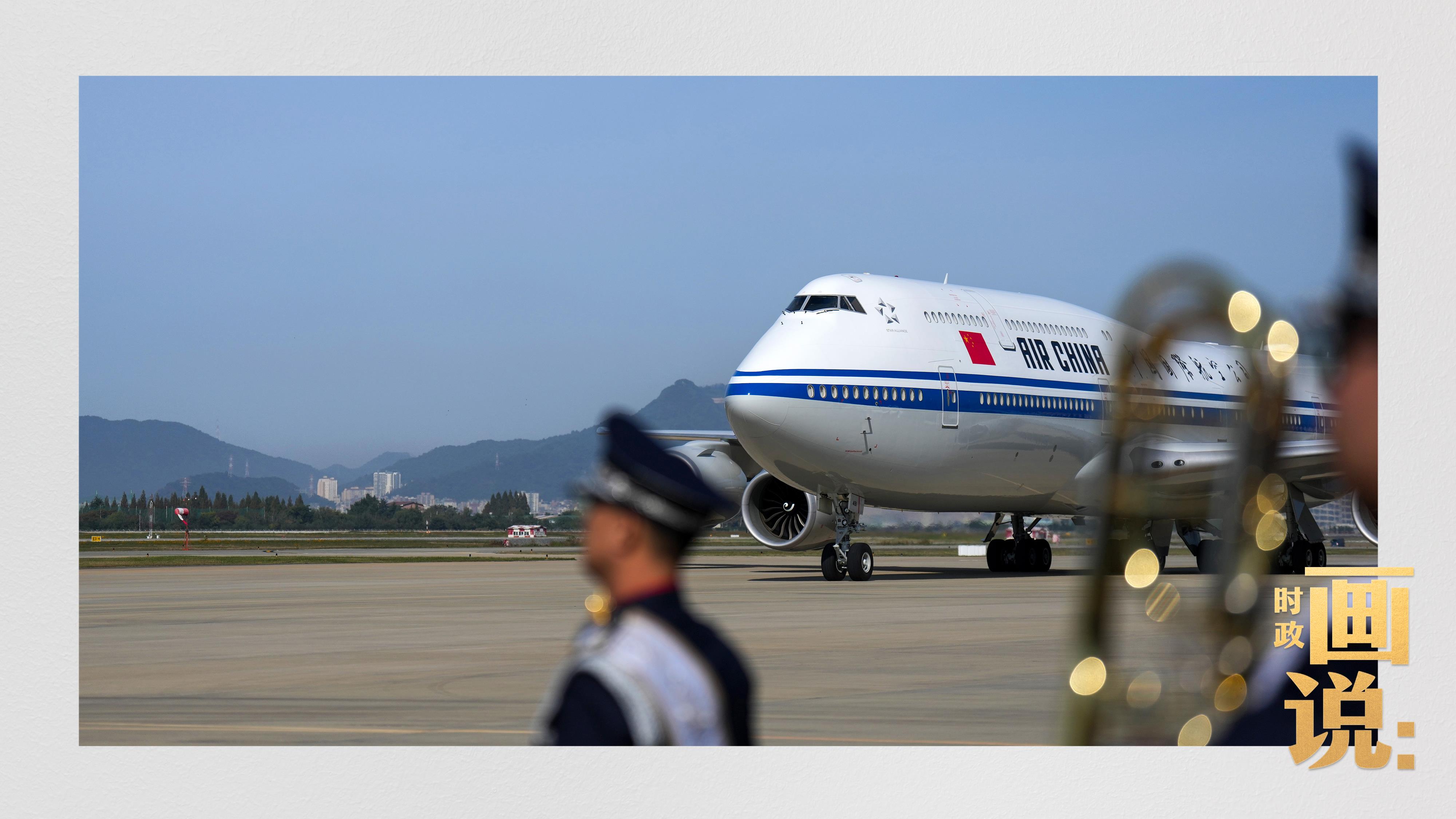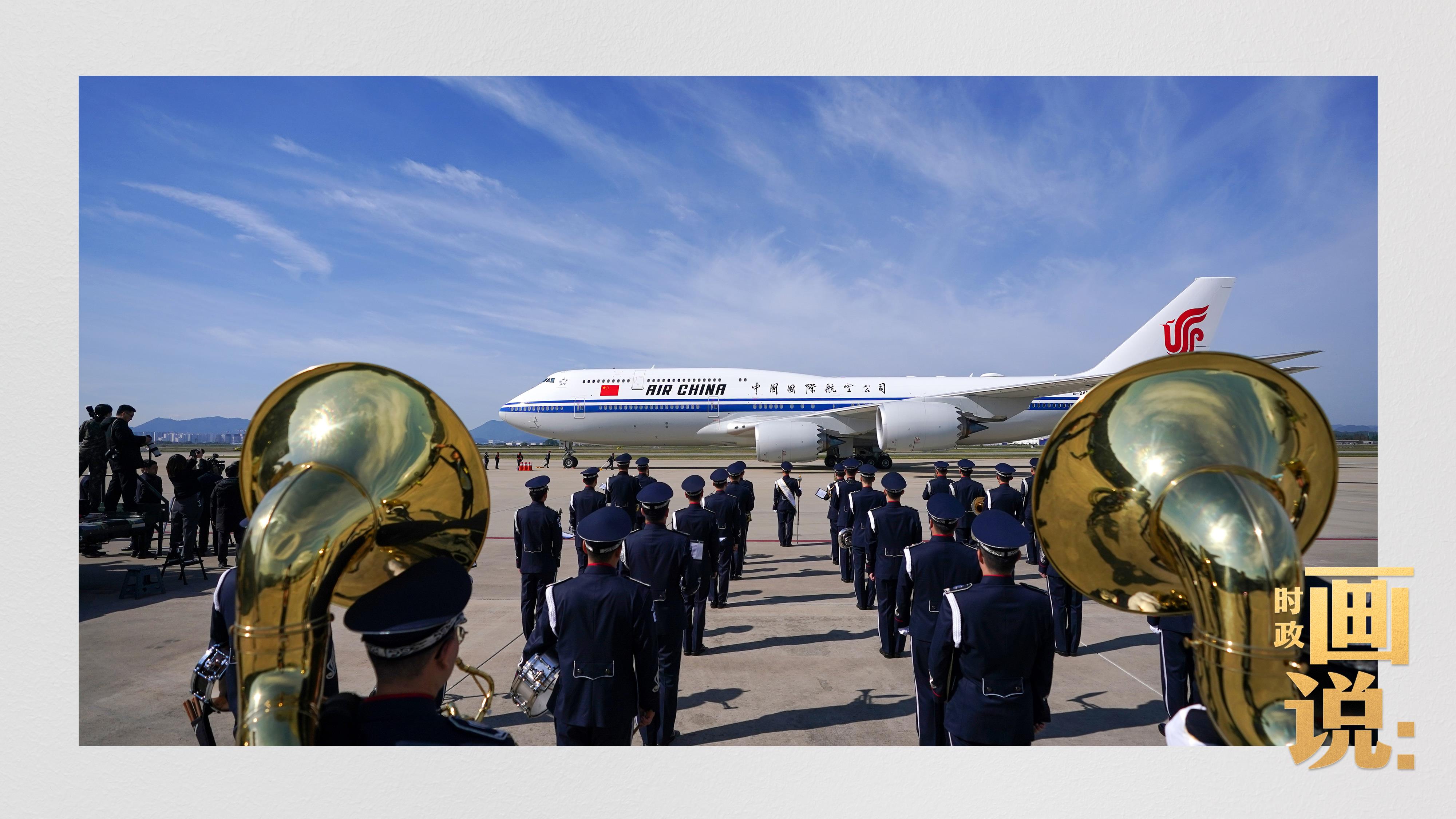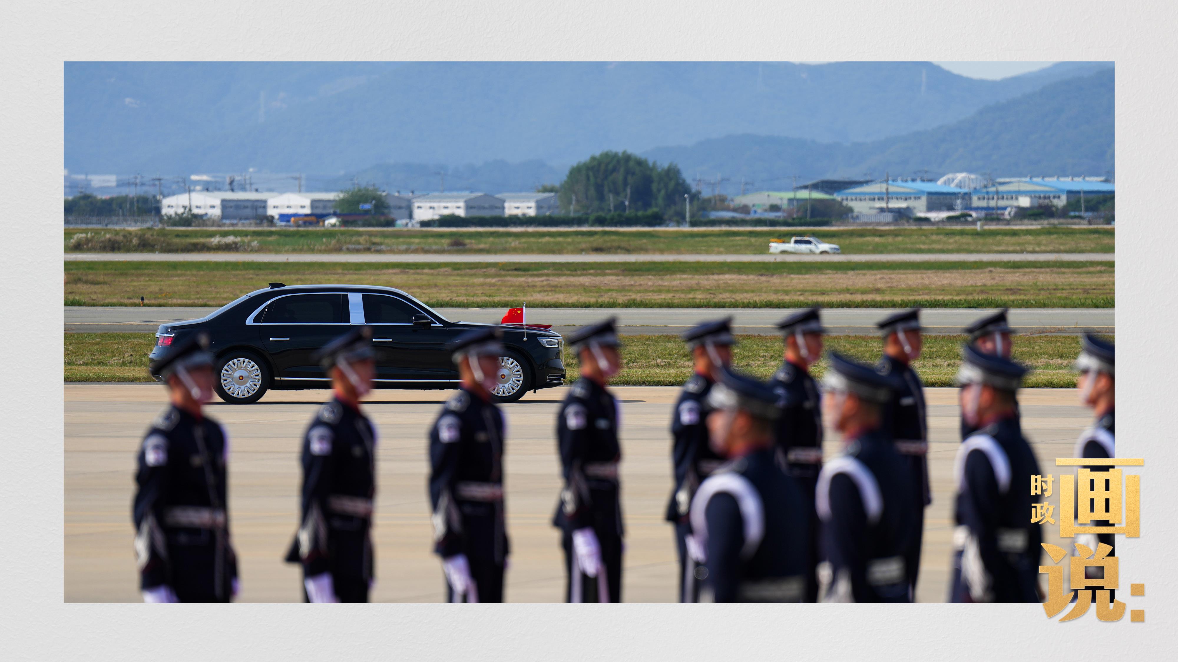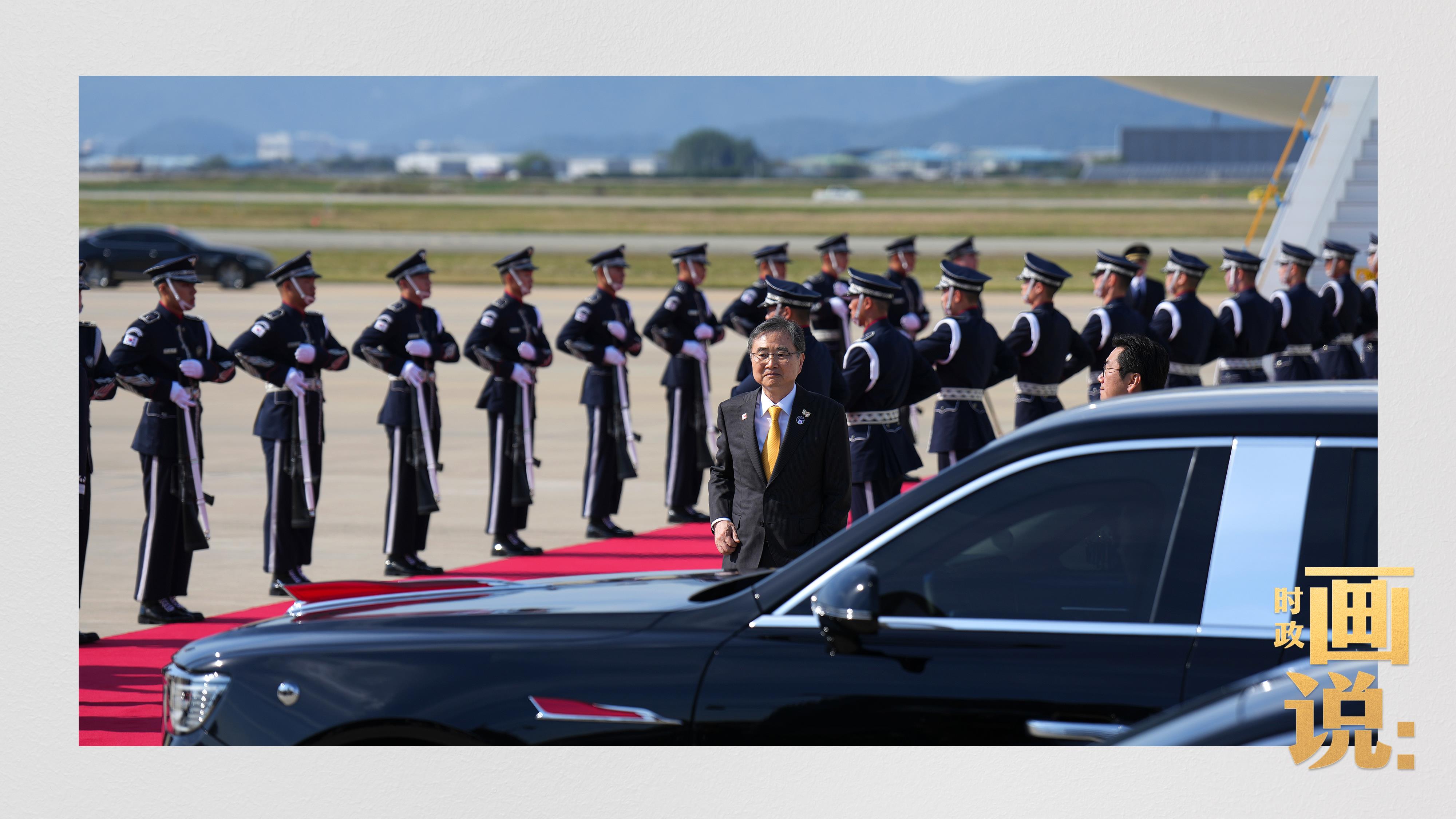 習(xí)近平抵達釜山金海國際機場時,韓國外長趙顯等高級官員熱情迎接。禮兵分列紅地毯兩側(cè)致敬,軍樂團演奏行進樂,機場鳴放21響禮炮。