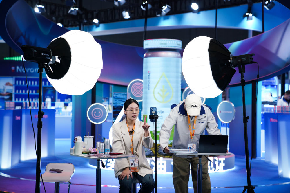 2025年11月4日,工作人員在第八屆進(jìn)博會醫(yī)療器械及醫(yī)藥保健展區(qū)直播。本屆進(jìn)博會直播密度大、形式多樣,有的展位專門搭建直播區(qū)域,燈光、背景、展板一應(yīng)俱全;有的展位手機(jī)一架、產(chǎn)品一擺,直播就地開始;還有的直播間是“流動的”,達(dá)人主播們拿著手機(jī)、別著麥克風(fēng),穿梭于各個(gè)品牌展位間現(xiàn)場推薦……八年來,進(jìn)博會影響力逐年遞增,越來越多的中國消費(fèi)者愿意通過直播了解進(jìn)博會上的“全球好物”。